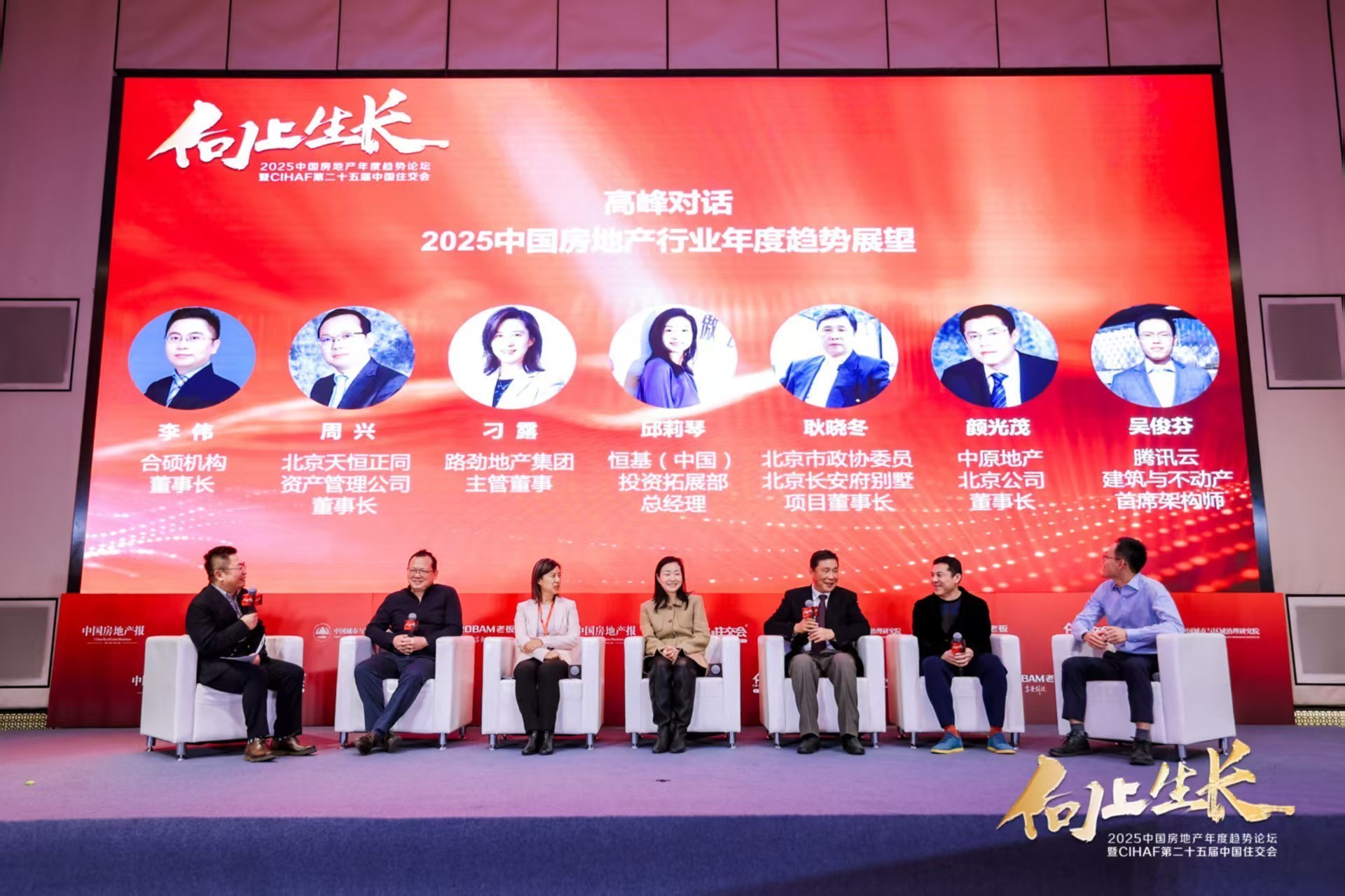 在本次会议的高峰对话环节,围绕“向上生长 ——2025中国房地产行业年度趋势展望”,北京天恒正同资产管理有限公司董事长周兴、路劲地产集团主管董事刁露、恒基(中国)投资拓展部总经理邱莉琴、北京市政协委员、北京长安府别墅项目董事长耿晓冬、腾讯云建筑与不动产行业首席架构师吴俊芬、中原地产北京公司董事长颜光茂等企业高层,进行了精彩发言与思想大碰撞,引发深入思考。
